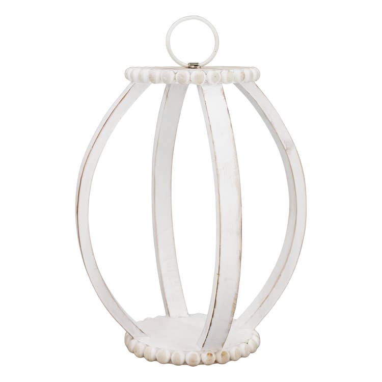 A beaded frame lantern with a whitewashed curved design, this large decorative feature is meant to display either real or LED candles. This piece is perfect for both indoor and outdoor purposes; you'll be making your house feel like a home with this piece! It'll be a complimentary feature for your porch or to illuminate a room indoors.