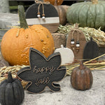 Measurements: 5 1/4" W x 5" T x 3/4" D "Happy Fall" Black Washed Leaf Cutout with Vintage Washed Wood Laser Cut Border and Text.