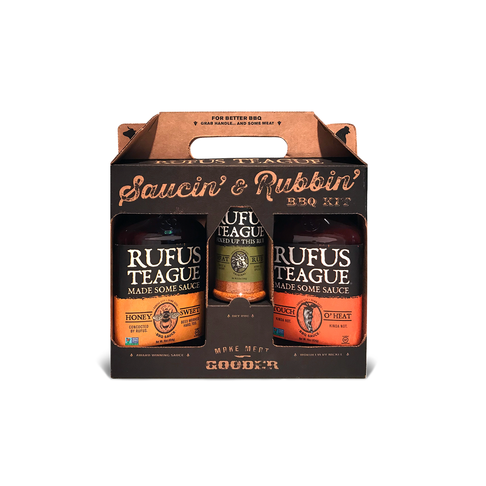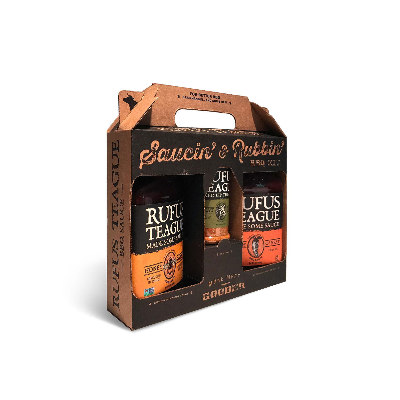 Give someone the gift of Rufus BBQ. All nice and purdy in this cool little box. The Saucin' & Rubbin' Gift Tote includes: One Honey Sweet, One Touch O' Heat and One Meat Rub. Aren't you the nice one giving out something so special.