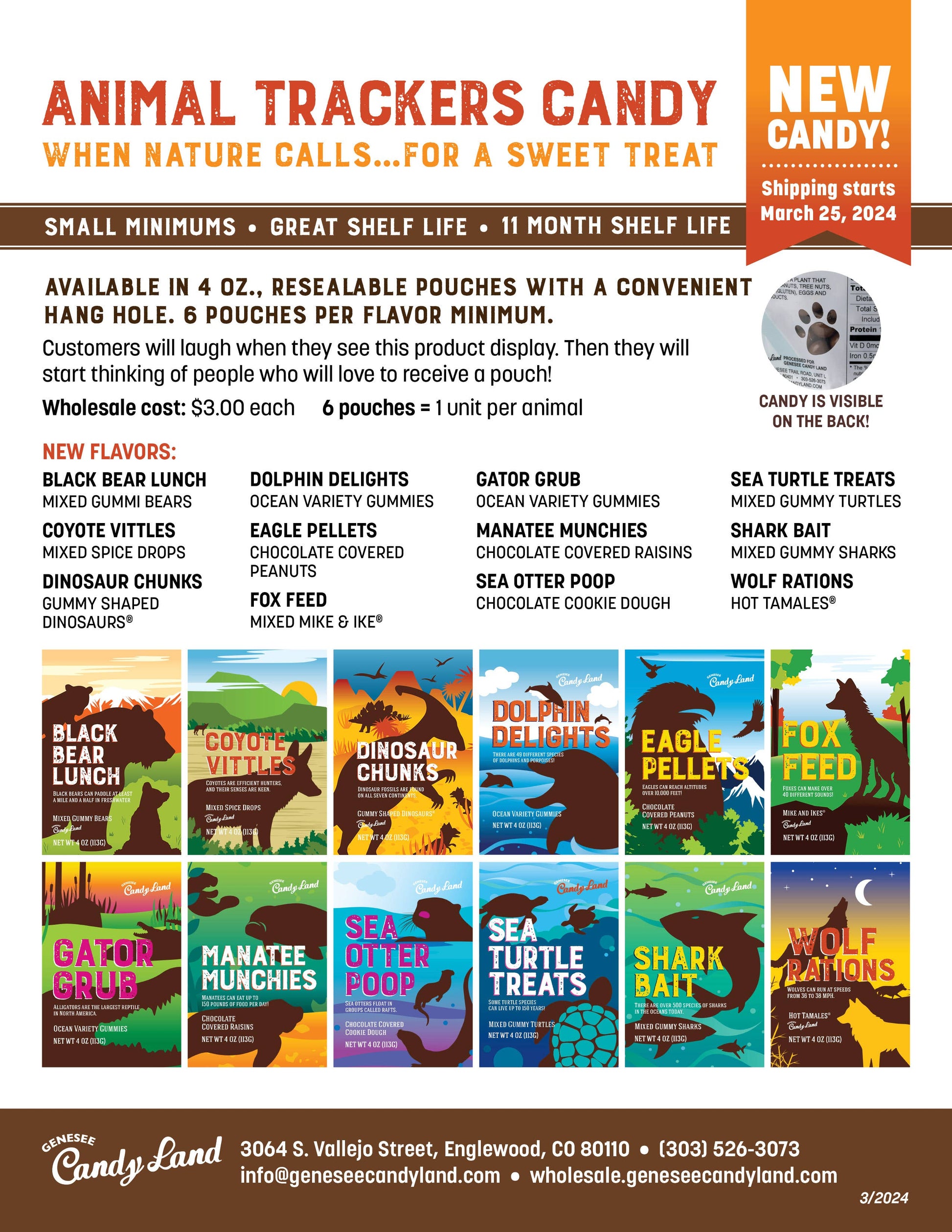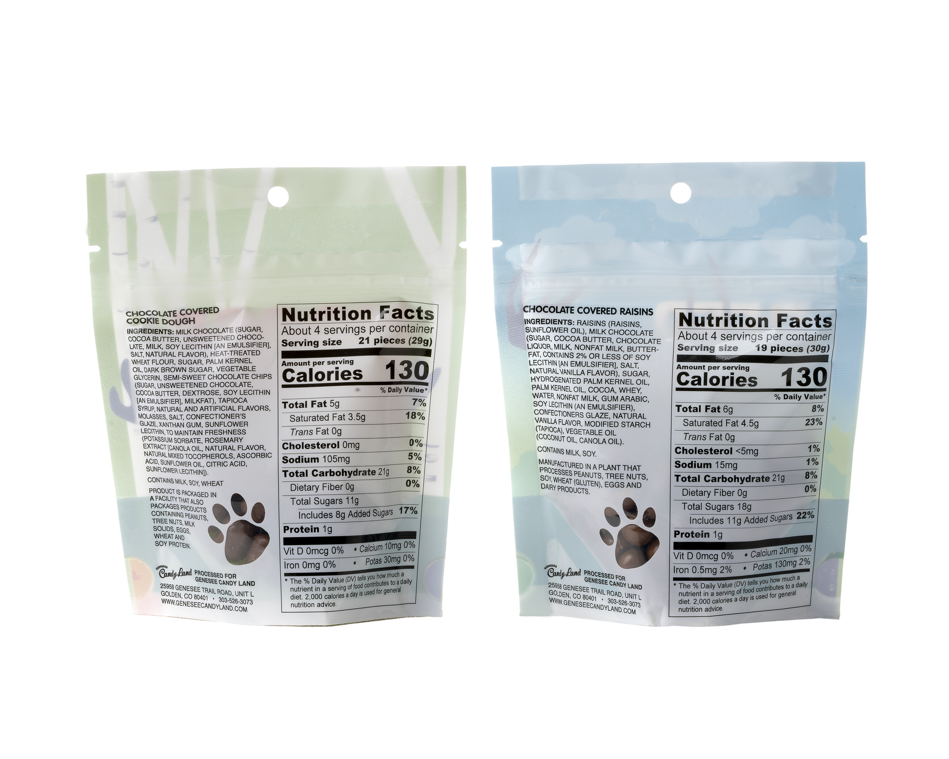 Dinosaur Chunks is colorful mix of Gummy Shaped Dinosaurs® in a 4 oz. stand up pouch. The packaging is really fun. On the back, there is a clear animal paw that shows the actual candy.