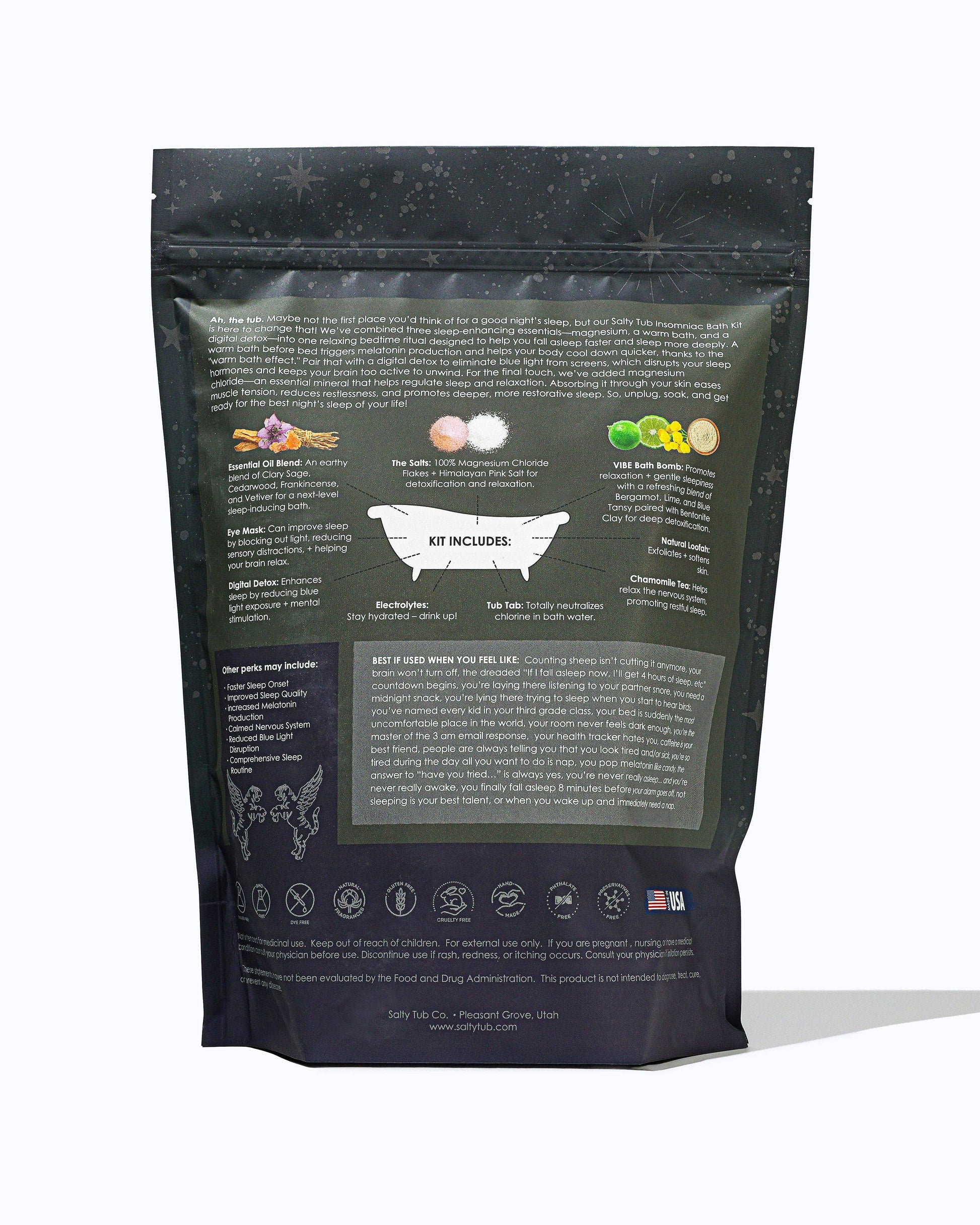 Ah, the tub—your new secret weapon for amazing sleep! The Salty Tub Insomniac Bath Kit combines three sleep-enhancing essentials—magnesium, a warm bath, and a digital detox—into one relaxing bedtime ritual. A warm bath triggers melatonin production and helps your body cool down faster for better sleep. A digital detox eliminates blue light, which disrupts sleep hormones. Magnesium chloride promotes relaxation by easing muscle tension and reducing restlessness. Unplug, soak, and experience your best night's sleep!
