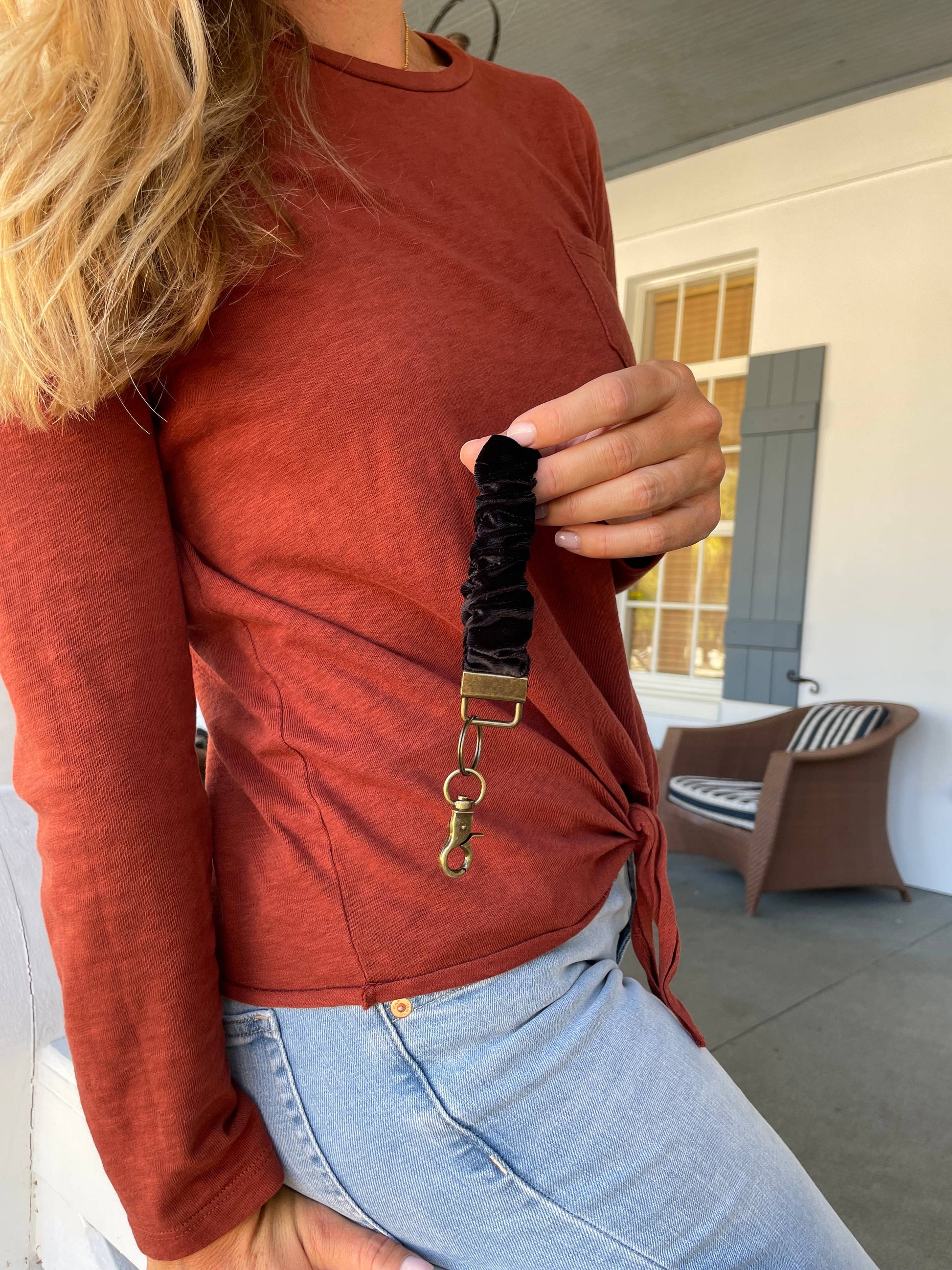 Soft Velvet, Midnight Black Print Scrunchie Keychain with antique brass metal finishes. Stop losing your keys with the helpful accessory. Pair with our charms to customize your look! Visit our instagram: @sunnyandeightyfive for more pics and see how interactive we are! We love supporting our boutiques via social media!! 💛🛍️📲☀️