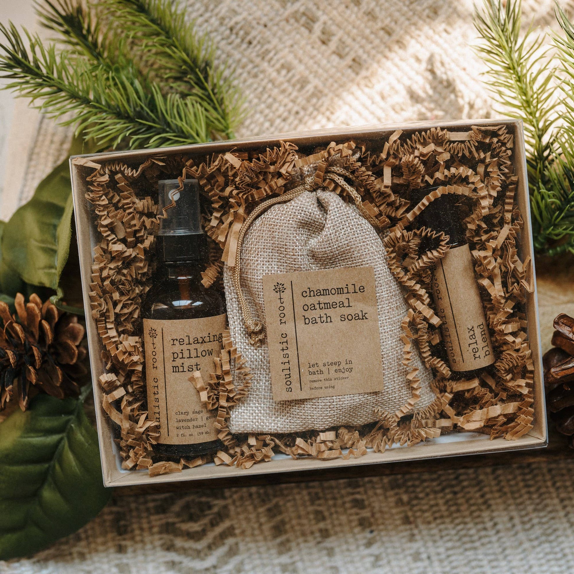 This gift set features a calming mix of three top-selling products designed to ease the mind, relax the body, and create a restful ritual. Packaged in a kraft box with natural crinkle paper, a clear display window, and finished with a black tie closure, it is completely ready to gift and shelf-ready for retail.